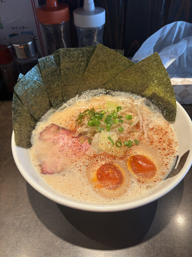 初来店です。入店すると、右手に券売機があります。ろくに券売機を見ずに、新札を入れると戻ってきます。ん?そこで気づく。新札使えませんでした。しっかり書いてあります。他は一万円札しかなく、女性スタッフさんに両替をお願いしました。 ん?こちらの女性どこかで見た気がします。両替は厨房から店主さんが渡してくれました。とその時!!!!あっ。こちら女性、相模原のインフルエンサーで活躍されている方じゃない?違ったらゴメンナサイ。 とても感じのよい女性でした。 そして、一番スタンダードなラーメンのチケットを購入。そして入口近くのカウンターから厨房の店主さんにチケットを渡すと、麺の好みを聞かれるので、初来店のお店はやっぱり普通でお願いします。麺は細麺でキレイです。スープはさっぱり目な塩とんこつなのかな?店外も店内も匂いは少ないですね。とんこつ醤油だったらすみません。味覚バカです。 そして麺。年配の男性には、茹で方は、ふつうが合います。いいですね。さらに調味料がいろいろ置いていただいているので、少しづつ試していきます。 まず辛子高菜。カウンターには辛さの注意書き。恐る恐る少し入れてみたら、辛ッ。 注意書きに納得。次にラーメンダレ。一回し。また少し味が変わりますね。次はごま。よくあるグルグルすりつぶせすタイプではありませんが、入れると香りがします。最後に紅生姜。文句無しですね。 私的には、辛子高菜が好みかな。 ごちそうさまでした。 今度は期間限定?担々麺がやっていた...