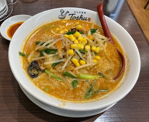 午前中の仕事を終えて午後からの仕事先に向かう途中、いつもの通り沿いにある東秀れんげ食堂の前を通りかかったら、ピリ辛台湾ラーメンのメニューが目に入った。最近は淡麗系の醤油や塩ラーメンを食べているが、担々麺探訪中に東秀でビャンビャン麺を食べて以来になるが、期間限定らしいピリ辛台湾ラーメンが気になって2度目の旨飯探訪をした。店内は7割近くが埋まり、お客さんの出入りが多い。いつものようにタッチパネルからorder。待つこと約10分で写真の如く配膳。どれどれまずはスープから舌試しだ。ウン、このアツアツスープは鶏ガラや魚介をベースに注文されたラーメンに応じてタレやスパイスを変えているのだろう。通常の醤油ラーメンより少し濃いめだが担々麺ほどのコッテリ感はない。スッキリしたピリ辛だ。支那そばのような細麺でコシがある。具材はニラやもやし、茹で挽肉が麺の上で構えており、スープの中にはニンニクスライスが味のハーモニーを醸し出しているぞ!これは旨い😋スパイスカレーを食べ始めたかのようにジワジワと汗ばんできた。フェイスタオルはいつも持参しているので、こういう時に役立つな。前回の時も期間限定🍜をいただいたが、東秀の前を通る時は要チェックだ。この店はチャーハンも上品な味で盛り付けも綺麗だ。隣の女性客達も食べていた。 次回はチャーハンを軸に旨飯作戦を考えてみる気になった。