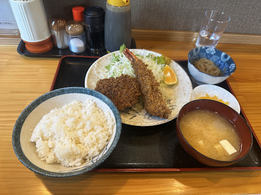 Read more開店少し前に到着しましたが、5分前には入店させて頂きました。 ボクはヒレカツとエビフライの定食を注文。 ご飯は大中小あり中(普通?丁度良かった!)を頼みました。 待つこと10分弱で食事が提供されました。 最初に味噌汁を一口飲み鰹節が効いていて美味しいと思いました。次にヒレカツを一口ガブリ!強烈に熱い🥵!メンチカツ位の円盤型で切れていないのでかぶりつくしかないのですが強烈な熱さで味わえない!せめて2カットし3切れなら1カットをフーフーしながら確り味わえたと思う!エビフライも熱々でカリカリですがボクはもう少しソフトな衣が好きです。 残念な点は米と漬物でした!米は日本政府の問題なので飯野屋さんは関係ないか!漬物は既製品の定食屋さんあるある黄色・ピンク系漬物!何とか自家製糠漬けやキャベツの塩揉み、きゅうりの塩揉み等、自家製を提供して欲しかったと思います。 又、エビフライにはタルタルソースが欲しいな〜! 色々言ったけど、全体的に低価格でお腹を満たしてくれる定食屋さんでした! PS:妻の頼んだピーマン肉詰め定食!ビジュアルがメニューのイメー...