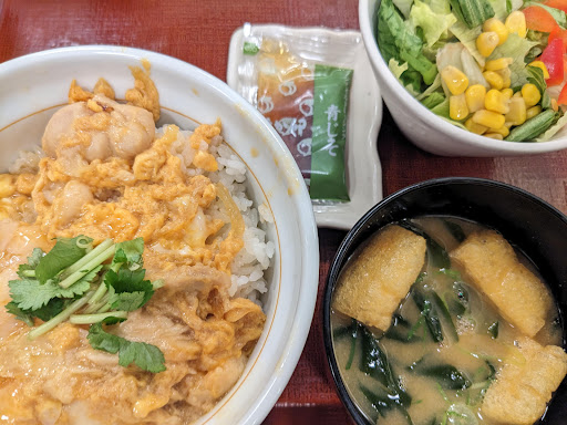 雨の日松山市から四国中央市に向かう道中晩御飯〜探して発見し訪問 ドライブスルーしようと駐車場イン あら、こちらからだと注文マイクに喋れない車の回転もしづらい やむ無く傘さして入店ㇲ 店内でいただく場合そのまま着席 持ち帰りは専用注文マシンが対応だ 店員さんがお水を持ってきてくれた タッチパネルにて 親子丼かな~ サラダと味噌汁付けて注文 唐辛子なんかお上品Vrをかけて喰らう おっさんなのにスプーンを使う!! サラダは青じそドレッシング 半分くらいかけて頂く 美味しく完食 ペイペイで支払い帰路に付く レシートにアンケートすると30円引 ついてた...