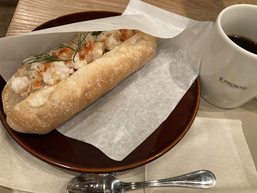 海老ドックとブレンドコーヒーを注文。コーヒーのみ先に受け取り、海老ドックの完成を席で待つことに。出来上がりを知らせるベルを渡されました。