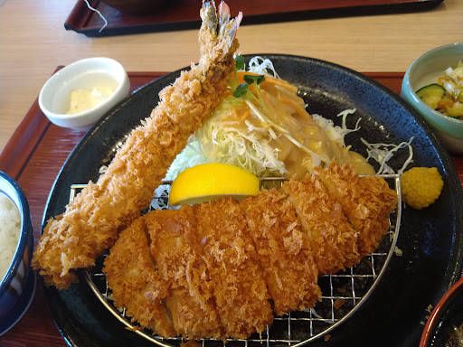 お肉のロースカツは脂の味が強かった。 脂が多いかも…エビフライは何だかボソボソしていた。昼時は混んでいます。