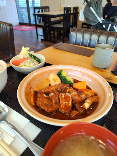 ・お膳への盛られ方もシンプル。黒のお膳に白系のお皿で配置され、余計な色味のないこのシンプルなお皿たちの上に、美味しそうなお料理の数々が。和なお膳の上に洋風な白いお皿。この辺も和と洋がうまく組み合わさった感を感じました。 ・そして、お料理。まずお味噌汁が美味しいのなんの。これだけをお替りしたくなりました。 ・ハンバーグは肉々しさと旨味と甘みを楽しめる一品で、ご飯がもりもり進みます。 ・ビーフシチューは、シチューを食べるというより、ビーフシチューのお肉をがっつり頂く感じです。このお肉が柔らかく、脂身の部分も美味しく頂ける一品。シチュー部分をご飯に少しかけて頂くのも、これまた美味でした。 ・〆の紫芋アイスもペロリ。