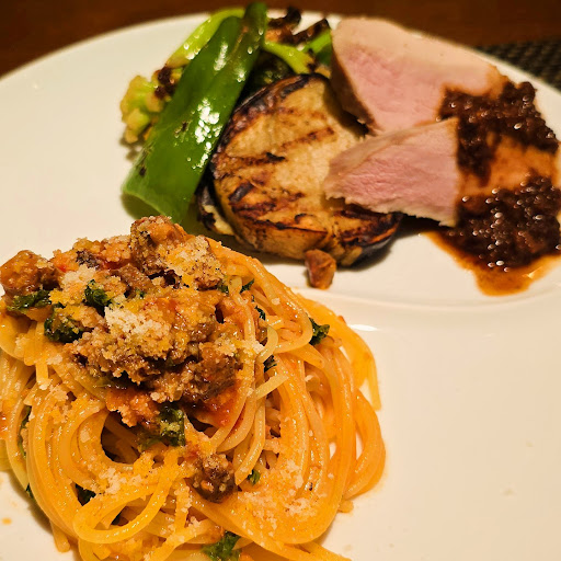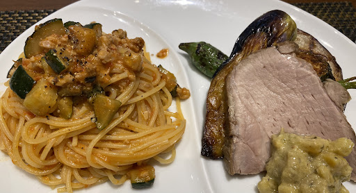 ところが、この後のメインのお野菜でビックリ。お肉と一緒にお野菜のグリルがいろいろあったのですが、どれもこれもめちゃめちゃ味が濃くておいしいんです!!お肉より野菜に夢中!!特にナスがとってもおいしかったです。 パスタも武州和牛を使っているそうで、見た目は地味だけど味は抜群。いやぁ、これは参りました。