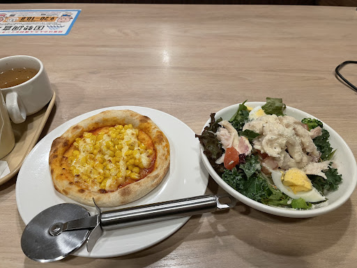あと、コレで¥1000はちょっとなぁ〜 ガストのコーンピザは美味しいけど、 去年と比べてだいぶ小さくなったなぁ🤣 🤣 (コーンピザ小➕ケールサラダ付きドリンクバー) せめてピザを去年のサイズに戻して欲しい。