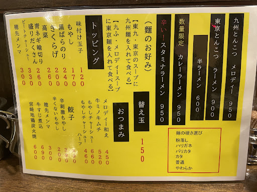 味は正直博多風龍とかと比べてもとりわけ美味いわけではなく、味の割に値段が高い。 常連客でないと、リピーターにはならんし、新規でリピーターを掴むには何かがない。とんこつラーメンは正直1回味わえば良いレベル。 時代に置いてかれたとんこつラーメン。東京も九州も食べ比べないと、些細な違いにしか感じない。そこに付加価値をあまり感じない。インパクトに欠ける。 とんこつにプライドあるなら、頑張ってほしい。 蓮田のメロディーは直ぐに閉店した。 ここは生き残れるか、常連客が減ったらどうする? 戦略は確かなのか、値上げ高騰の時代、何か、がないと、生き残れん。