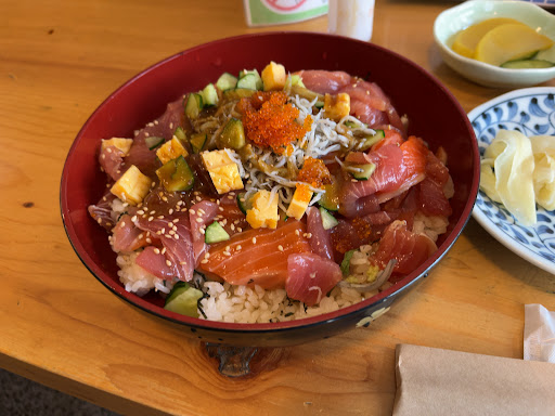じんべえチラシには ・マグロ ・サーモン ・釜揚げしらす ・角切りの玉子 ・きゅうり ・とびっこ ・そしてご飯の上に刻み海苔とたっぷりのゴマ