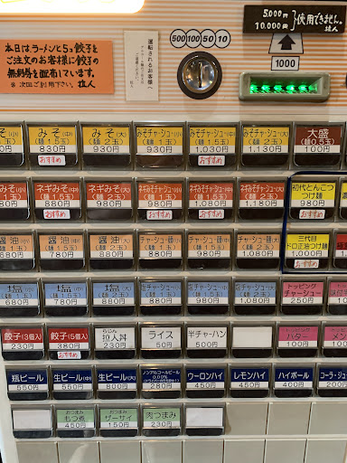 好みが分かれるところ 餃子を酢醤油につけるとなぜか甘い、謎。 チャーシューが油のすごいところを使っているので半分脂身を食べさせられた、食べ終わったスープにはものすごい油が浮いていた。それとギョーザはニンニクを付けるか聞かれた。食券機には2玉まで選べるボタンがご丁寧に並んでいたので、学生ががっつり食べに来る、そんなコンセプトの店なのではないかと思った。でもここ学生の街じゃないよ笑