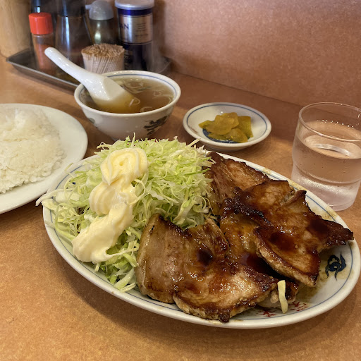 焼肉定食を食しました。 税込1020円です。 ライス、中華スープ、沢庵漬け、千切りキャベツ、ミニトマトがつきます。 千切りキャベツにはたっぷりとマヨネーズがのせられています。 豚ロースは肉厚で食べ応えがありました。 脂身に甘味があって、噛み締めるほどに旨味と味わいが口の中に広がります。 焦げ目はカリカリとして香ばしく、甘辛い焼肉のタレが食欲を増してくれます。 シャキシャキとした千切りキャベツの食感も良いです。 ライスは普通でも他店では大盛ぐらいのボリュームがあり、炊き具合も良く食が進みました。 女性はライスを半分で注文している人もいるようでした。 熱々の中華スープにはネギが入れられていて滋味溢れる味わいがします。 食べ終わると満腹になった満足感がありまし...