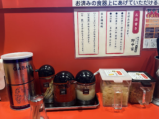 調味料は写真な感じ。定番のコショウ、酢、豆板醤、ニンニクの他に、刻みしょうがと刻みニンニクがあります。