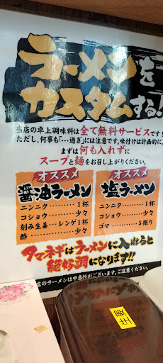 食券は券売機で現金のみ、注文時にお好み聞かれます!紙エプロンあり❗ 味のお好みお伝え下さい。 テイクアウトやってますが中華そば❌ 炒飯❌️トッピング類❌️は注文できません 気をつけてご利用ください!デリバリー対応店 値段以前より高くなりました。 カウンター席️⭕️テーブル席️⭕️駐車場なし❌卓上に味変用️⭕️店員さん元気あり️全員じゃあありませんが△ 10回飲みきると1杯無料になります。 家系ラーメン苦手な人はチャーハン餃子サイドメニュー中華そばあります❗ 駐車場❌駐輪場❌ LINE登録したらトッピングひとつ無料になります。 ライスバーおかわり自...