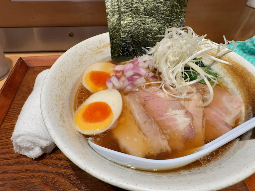 全体的に美味しく食べていましたが、貝出汁のパンチは控えめなので、食べていると貝出汁風味が感じられなくなってきて、途中で何度も水を飲んで口直しをしました。 また香味野菜の紫玉ねぎ、白髪ネギの味が割としっかりしているため、これでも貝出汁風味が飛んでしまっていました。とは言え、ラーメン全体で考えれば、この香味野菜の味の刺激は個人的にはアリです。 またスープは割と濃い味なので、夏に食べるのは塩分的にもいいんじゃないでしょうか。