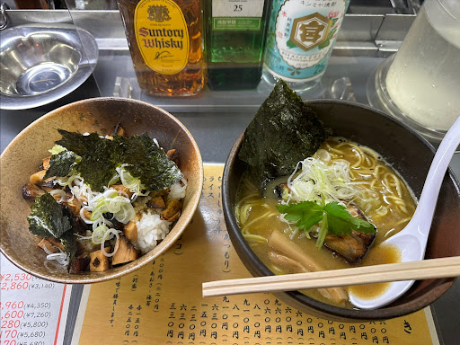 自分史上ワースト1、2を争う店だった。2022/5/4、18時半頃、1人で訪店。照明が点いていて看板が出て、厨房にオッサンがいるんだろうから、営業中。入ってすぐ、酒瓶の並びが目につく。座るまで無言。BGMがやかましい。メニューを選んでいる最中、水のポットを持ってきたのに気づかず、そのポットと自分の手が当たる。無言。この時点で帰れば良かった。ラーメンと餃子を注文する。無言。 聞こえてんだか何なんだか分からん。味魚濃厚かつお拉麺、麺はツルツルとした、淡白な丸麺。チャーシューはホロッと柔らかく、濃厚な味。メンマは冷たいが柔らかく、物は良い。スープがぬるい。食べ進める中、1度も吹かずに食べた。餃子と一緒に付いていたサッパリとさせようとしたであろうつけ汁は悪くはない。が、醤油が見当たらない。七味とコショウはあった。ラーメンを持ってきた時、何か言ってたが聞き取れなかった。 ラーメンの総合評価は星2。ギョーザを持ってきた時も無言。箸の場所が分からず、聞くと小さなタオルがかかったままの箸箱を手だけで案内される。 接客業やる気ねぇんなら店やるな。何か色紙だのがダラダラ貼ってあったがどうでもいい。 不味いは接客最...