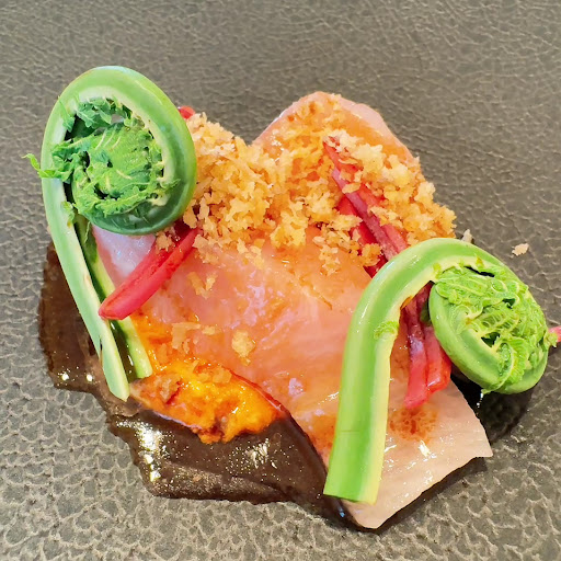前菜は3種、主菜は4種から選べました。 前菜は、カンパチのコンフィ人参のピューレバルサミコソースにしました。 カンパチが厚くカットされていて、食べ応えありました。 人参のピューレの甘味とバルサミコの酸味がちょうど良く、カンパチをとても爽やかにいただけました。