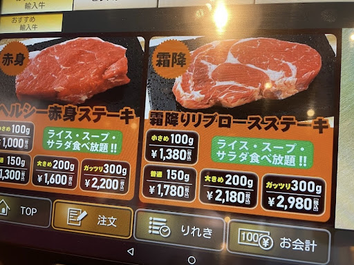 「こちらは霜降りリブロースステーキとなっております。」とのこと。