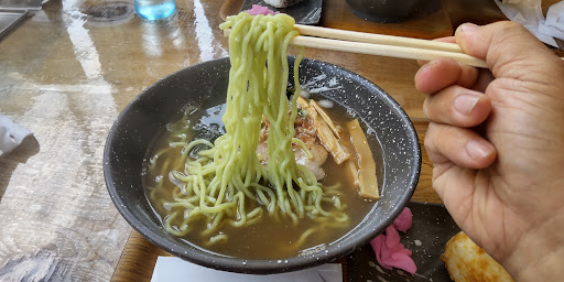 次に麺が緑色でギョっとします。 食感はツルツルもちもちな多加水麺風ですが、表面のツヤはそれ程に感じません。 ここでまたメニューの説明を読みますと。 この緑色はクロレラを練り込んであるとの事。クロレラってなんだっけ?とググると、太陽の光合成でタンパク質を作る単細胞生物との事で、クロレラのサプリを色々売っています。 ははあ。身体に良いのですね。 それが味にどう変化をもたらしたかは解らないですが。少し太めのもちもち麺はコシも強く美味しいです。