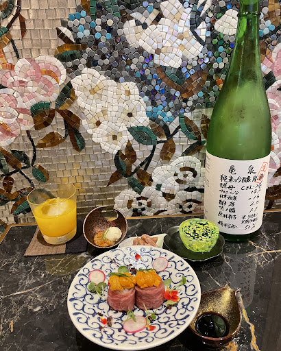 無添加うにや新鮮魚介の創作小鉢料理などが日本酒が楽しめるダイニングバーで店内はラグジュアリーな綺麗なところでした✨ 希少な日本酒やお洒落な新興酒造の日本酒など様々なお酒がありました♡
