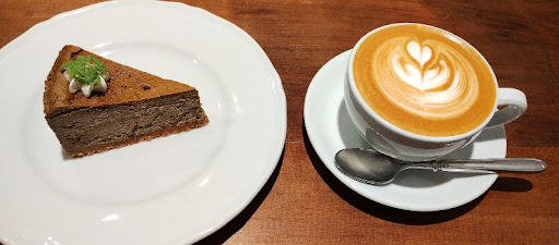 カフェラテ 500円とほうじ茶チーズケーキ 550円をいただきました。 ほうじ茶のチーズケーキはフォークを刺したところから、バラバラに崩れ食べるのに苦労しました。 お茶の割合が多いと感じる。