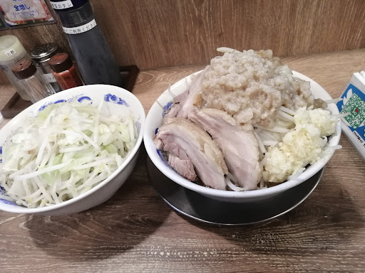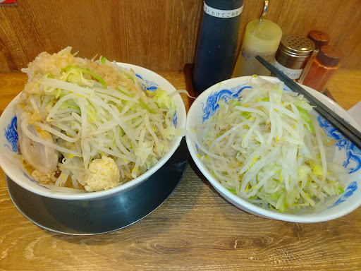 客は3~7人程。 以前来たのは1年以上前であり、マズかったので暫く遠慮していた。 店舗が新しくなってコロナ対策の衝立が設置(椅子が固定式なので狭い)。店員が女性2人なので愛想良く対応してます。 久々なので控えめにラーメン並盛り200g、680円。無料トッピングは野菜ダブル、ニンニク、脂に。 スープは他の二郎系よりもライトではあるがまあまあ旨い、豚は5~6ミリのが1枚、野菜はメインの方がキャベツ多し、サブ丼の野菜は99%がモヤシのようである。 サブ丼野菜は茹でただけなので(メインの野菜も茹でただけではある)味付けはしていない。ラーメンのスープに浸けながら食うとスープが薄くなるので卓上のタレを使うが、タレもそんなに旨くはない。 野菜はダブルよりマシ程度の方が良いかも(マシだとサブ丼は無い)。 野菜ダブルだと安い割には満腹になる。
