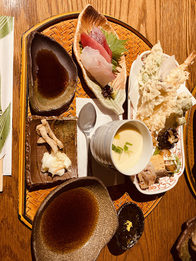 和食コースを食しました。 税込3300円です。 前菜、お刺身、天ぷら、茶碗蒸し、酢の物、鱈の甘酢餡かけ、御食事のコースです。 前菜に出された小魚はフリットされて香ばしく身はふんわりとしています。 ホタテは味わいがあって味噌の味わいも良いです。 お刺身は赤身、中トロ、白身、甘海老などです。 身がしっとりとして脂がのり、山葵が旨味を引き立てます。 天ぷらは熱々で出されて海老、蓮根、茄子、舞茸、葉の物などです。 海老はプリっとして熱々の身の食感が快く、蓮根はサクッと歯が入り、茄子のふんわりとした食感も良いです。 舞茸は旨味があり、葉の物は油を纏って後を引く味わいです。 茶碗蒸しは熱々でたっぷりと出され、具材は三つ葉、シメジ、銀杏、海老などです。 三つ葉の清涼な香りが良く、銀杏の風味も良いです。 酢の物はあん肝と大海老です。 あん肝はねっとりとしてピリッとした辛味が良く、大海老はぷりっとして食べ応えがありソースがその美味さを引き立てます。 鱈の甘酢餡かけは、揚げたての熱々で出され、衣が香ばしく、身はしっとりふんわりとして甘酸っぱいソースが良いです。 ご飯の炊き具合も良く、お米に甘味があります。 お漬物は奈良漬けと白菜漬けです。 味噌汁の具材は三つ葉とわかめで、濃厚な出汁が出ています。 ...