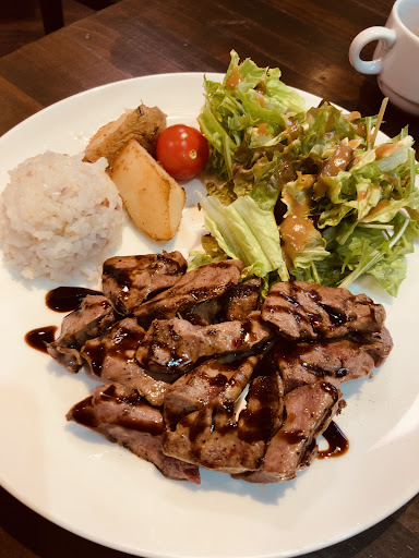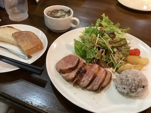Read more2024年07月17日ランチで11:30くらいに訪問。 男性1人のお客さんに次いで2番乗りでした。 建設系の人たちが講習等で集うビルに、意外なレストランです。 基本的にセルフです。QRコードを読み取り、「日替り肉料理ランチ」と「鹿ステーキサラダ」を注文しました。 配膳を待つ間に、おかわり自由のパン、スープ、ドリンクを取りにゆきます。 パンは、皮目がややかため、なかはもっちりで好みです。何もつけずにいただきました。 スープは、白菜とセロリとキクラゲが入った野菜具沢山のスープでした。スパイス(なにかはわかりません)が効いています。おいしておかわりしました。 ドリンクは、レモン水とアイスコーヒーに牛乳(←これはうれしい!!)を入れてカフェオレをいただきました。 「日替り肉料理ランチ」は、鴨のローストでした。レアでやわらかいです。付け合わせのサラダのドレッシングはバルサミコ酢(たぶん)が効いていて大人なおいしさです。 途中でパンにのせてオープンサンドにしても楽しめます。 「鹿ステーキサラダ」は、ごくほのかに野生の香りがします。慣れている方には少し物足りないかもしれませんが、素人のわたしにはほどよいでした。赤身でさっぱりしています。こちらも酢の酸味がいい具合に効いています。 お客さんは約8割くらい女性でした。意外にも男性の1人客も2人いました。 ゆったりできて、おいしいランチをお値打ちで楽しめました。 おいしくいただきました...