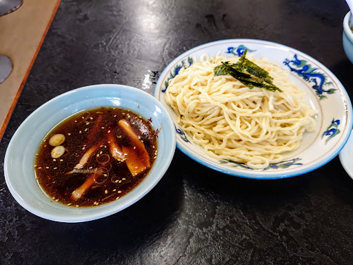 例えるなら、冷やし中華風の、そこまで酸っぱくなく、しょっぱ過ぎないいい塩梅、一味系のような辛味がアクセントになった、醤油系つけダレ。温かいです。 割りスープは、セルフで店の入口側カウンターに置いてあります。説明はないので注意。セルフです。