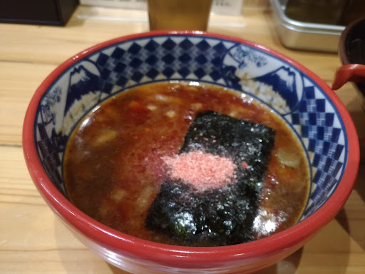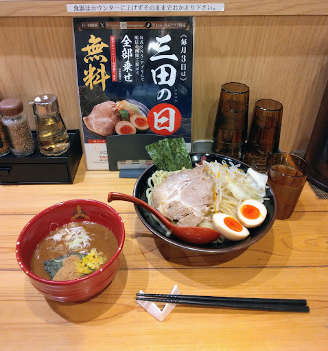 三田製麺所さんは2回目の訪問で浦和店は初です。 前回桜木町の方で初めて利用してチェーン店でこのクウォリティ出るのかと思いびっくりしての2回目。 浦和店はSuica等のIC利用可能が便利。 口コミにあるような接客サービスも問題なく飲食店として違和感も特にありませんでした。 カウンターの席は少し狭めにとられており、奥行きがないのが少し気になりはしますがラーメン屋として問題ない範囲ではあります。 唯一気になった事が、カウンター席にある調味料、箸入れが全卓なく隣席にお客様がいる場合とても取りづらいことです。 全卓ある方が良いとは思いましたが先述した通り、カウンターの奥行きも無いため配置問題かなとは思います。 席と席の間に設置してあればよいのですが、席の眼の前にあるためその席を利用しているお客様がいると、隣の席の人はとても箸が取り出しづらい状態ですがたまたまかもしれません。 つけ麺は桜木町店のときも感じましたが、やはりつけ麺は氷水〆か、しっかり冷たい大量の水とある程度時間をかけて閉めないと食感が少しイマイチになるところが、つけ麺有名人気店との違いかなと感じます。 前回は初めての来店で看板メニューではなくて特濃を食べてしまったので今回は普通のつけ麺を食べました。 浦和の場合どうしても近くの狼煙さんと比べてしまうことが多くなってしまうのですが、違いは麺の〆具合とスープの器とつけ汁の熱さでしょう。 つけ汁は最初少し弱めで麺の味が勝ってしまっていると感じましたが、最後つけ汁の塩っ辛さが印象に残った為少し混ぜたほうが良いかなと思ったのですが、おそらく温度帯が低くなることによって味が強くなったのだと思います。 つけ麺は、つけ汁が強くないと麺に負けてしまうのですが塩っ辛さを感じさせないのが人気店のスープバランスだと思います。 しかし、気軽にどこでも濃厚魚介つけ麺が食べれるのは凄いなと思い...