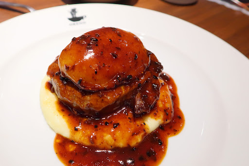 「フォアグラと牛フィレ肉のロッシーニ」 ・フォアグラ、フィレ肉ともに臭みなくしっかりと濃厚な味わい。これが口の中で絡み合う喜び。 土台のマッシュポテトのほんのりとした甘みも嬉しい。