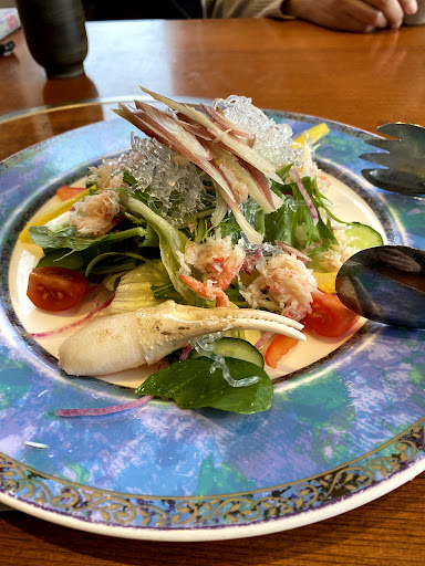 食事は文句なしです。刺身、陶板焼き、サラダ、焼きタラバ、天ぷら、茶わん蒸し、お味噌汁、すべて身がびっちり詰まってとても美味しかった。 揚げ物はアツアツで、一緒に出される塩がおいしい。 一品料理は、カニクリームコロッケ、肩身から揚げ、中落ち天ぷら、カニグラタン、だし巻きカニ餡かけを注文。コースの途中でどんどん頼んだので、最後は全員動けなくなるほど満腹。一品料理は会席コースが終わったら頼んだ方が良いです。そしてどの一品料理も大変美味でしたが、中落天ぷらは食べやすく、だし巻きカニ餡かけが揚げ出し玉子焼きになっててびっくりするほど美味でした。