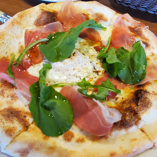 【ランチセットB】税込み2,200円 《ピッツァ》 全体的には見たとおりで、「爽やかな」ピッツァ。 ルッコラのいい香りと味がする。それと生ハムはなんと自分で作ってるそう。「作れるものは自分で作ります」と。バターがほどほど効いていて、見た目カツオブシのようなきれいで透明感のある生ハム。 もちもち感がすごい。