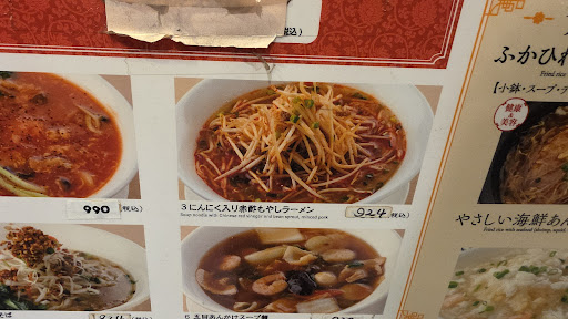 Read moreLiveのついでに昼ごはんに寄りました。結論から言うとなかなか美味しかったです。 回鍋肉は特に豆鼓醬が特徴的に良く効いているような感じで、ちょっと他の中華料理店と比べても独特感がありました。 個人的にちょっと気になったのは、店外の立て札というかメニューにあった「にんにく入り赤酢もやしラーメン」が旨そうで入ったんですが、店内のメニューになるとなぜか「にんにく」が外れて「赤酢もやしラーメン」になっており(レシートもそうなっていました)、生粋のニンニク星人としては危機感あったんですけど、実際出てきたものにニンニク感は感じられず、なんかどうも中華スープの上でラー油だけが立っちゃってるような微妙な「なんか足りない感」を感じてしまいました。 これ、コストダウンとかの理由でニンニク抜いてるのだとすればそれが原因なのかなぁと思いますし、もしこれ書いてないだけでニンニクが入っていたなら、それを感じない程度には弱すぎるので、外のメニューで期待が大きかった落差でそう感じているのかもしれません、いずれにせよちょっと残念な味でした、決して不味いというわけではないですが、期待してたものが大きかったので。 若干店員さんの淡泊な接客が気になりますが、店内の席もまぁまぁ数もあるし騒がしくもなく、落ち着いて食事で...