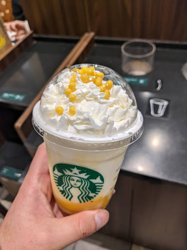 Read moreバナナ好きにはたまらない。 スタバの『バナナナバナナ フラペチーノ』が登場!待ってました(笑) 早速買いに行きました。 周りを見渡すとさすが期間限定だけあって飲んでる方がちらほら。 土曜のため、列に並んで購入。 見た目も夏先取りらしい鮮やかさ。 バナナの果肉感と甘酸っぱさがクリームとの相性抜群♪ 美味しく頂きました。 そして店員さんの親切な対応に感動。 並んで受け取りを待っていると3人前のお客さんが店員さんに「さっきまで席が空いてたんですけど・・・持ち帰りに変更できますか?」と聞いていて、店員さん「畏まりました!お席が埋まってしまい申し訳ありません。すぐに持ち帰りに詰めなおさせて頂きます」と明るく元気な対応。 すぐに用意してくれたけど、待ってる間に、席がちらほら空いてきた。。申し訳なさそうにお客さんが待っていると店員さん「お待たせました!袋には詰め替えましたが、お席でゆっくりされていっても大丈夫です。ありがとうございます。」と店員さんの対応。 ひっそり見ていた私は素晴らしいと感動しました。 良い気持ちで、フラペチーノを美味しく頂...