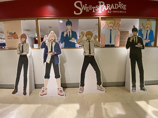 I went to Sweets Paradise for their Chainsaw Man collaboration. I made a reservation a few weeks earlier through their app. Paid about 2,200 yen for the meal, latte, and drink bar. The presentation definitely was there but in the end a few fruits with whipped cream pancakes and honey was just okay…nothing special. The latte was perfect to have accompany the dessert, a little pricey but again the presentation was the best part. It’s worth checking out but only for Chainsaw Man fans…I doubt I would’ve gone if this was One Peace or Pokémon (not that there’s anything...