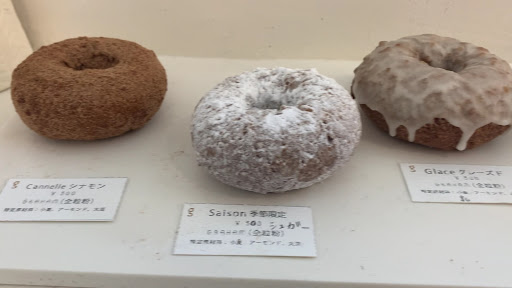 外観からして、おしゃれな雰囲気 イートインもあり4名くらいなら座れるかな? ドアを開けると右手にメニュー用のドーナツがならんでいます。 Graham donut(全粒粉)ザクザク系 tofu donut ふわとろ系 の2種類があります。