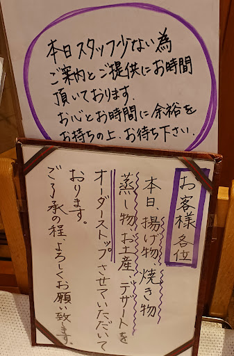 ③店頭の立て掛けた紙、 席へ案内する前に、ご一読下さいなどという声掛けがあればいいなと。見落とすこちら側(客)が悪いのでしょうか。 ⬆️ そもそもオーダーストップであれば、 一品料理等のメニュー下げるべきでは?