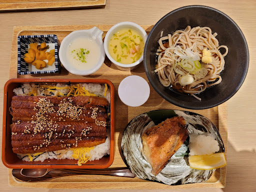 *うなぎ御膳 赤魚西京焼き(1750円) こちらは鰻丼とお蕎麦、赤魚の西京焼き、茶わん蒸し、山芋とろろ、お漬物と豪勢なセット。これで御膳より+250円とは結構お得ではないでしょうか。 西京焼きは、白みその割と薄めの味付け。タンパクさもしっかりなので、濃い味が苦手な方にはばっちりかもしれません。お蕎麦も安定感のある味(化調系?)で、コシもしっかり。鰻丼の鰻はふわっとして食べ応えあります。