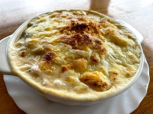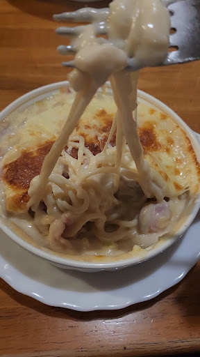 今回私は、スパゲティグラタンをいただきました♡たっぷりのホワイトソースにベーコン、エビ、玉ねぎ、マッシュルームと炒めたパスタ。しっかりした味付けが大好きです。また食後のアイスがまた嬉しい、オススメのメニューで...
