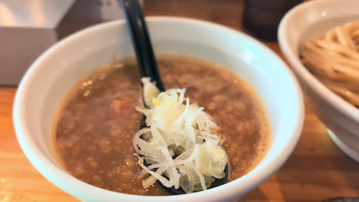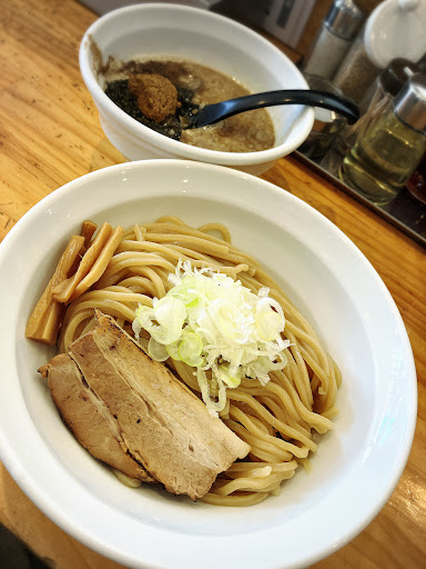 つけ汁は、シャバシャバな豚骨魚介系。 海苔の上に乗った魚粉を混ぜ混ぜ〜 うーむ… 予想通り麺との絡みも良く無い。 卓上のお酢と白胡麻を加えて、魚粉も更に入れてみる。 うーむ… お酢をかなり多めに入れてみよう。 少しマシになったな。