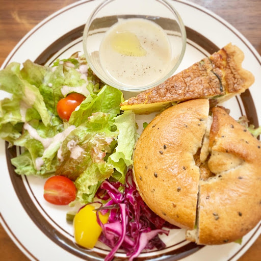 日曜日のランチに来訪。 【こんな店】 ベルク坂戸八幡店の前にある小道を入ると、右手のコインパーキング隣にある民家カフェ。一階部分をカフェにしたこじんまりしたご夫婦で経営されているようです。駐車場はありません。 客層は女性客やカップルが目立ちました。 おしゃべりしながら、手作りの料理を楽しむ方に向いているかもしれません。 【オーダー】 ●シェフの気まぐれランチプレート@1200 (サラダ、自家製パン、スープ、小前菜、メイン、ドリンクつき) ・パンは自家製で、サラダのドレッシングは紫色なので個性的ですね。この日のスープはサツマイモでした。ここまでは、優しいあじでした。 ・小前菜のキッシュが一番濃い味なので、最後に食べた方がいいですね。 ・ドリンクは追加料金を支払って、カモミールティーにしました。味は普通でした。 【メイン料理】 ●チキンジェノベーゼソースのペンネ ・一口分もらいましたが、ジェノベーゼソースが効いていて、チキンとよくあいました。 ●生ハムとルッコラのベーグルサンド ・自家製ベーグルは、端がカリッとしていて、やや噛みごたえのあるもので、生ハムとレタスとマッチしていて、食べごたえありました。 【デザート】 ●ランチ限定ミニデザート@220 ・この日はティラミスでした。しつこさはなく、エスプレッソの味がよかったです。 ●びわタルト@660 かなり満足しました。生クリームとカスタード、そして琵琶。タルトはしっかりしていて、とっても美味しかったです。 【総評】 味は手作りで優しい美味しさで、キッシュとびわタルトは絶品でした。あとは、ランチで忙しかったのでしょうけど、もう少しゆったりと接客してい...