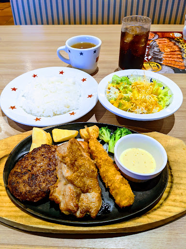 ステーキのどん 坂戸店へ行ってみました。 営業時間は10時00分から24時00分です。 駐車場は車 75台収容可能ですが、境界が見当たらないので、同じ 安楽亭グループの店舗である、隣接する「Don イタリアーノ」と共用のようです。 車椅子利用者専用駐車スペースは、1台分入口の近くに設けられています。入口 へのスロープも あります。 駐輪場は、入り口の 左手にあります。 今回は、日替わりランチメニュー (水曜日)の「ハンバーグ (130 g)&チキン&エビフライ」(ライス 、スープバー (2種類) おかわり自由)に ランチ ミニサラダとドリンクバーを付けて美味しくいただきました。 このお店は、 施設・ 設備が新しく、照明にも工夫が凝らされ間接照明も 駆使して おしゃれな空間を演出しています。トイレも綺麗です。男女別トイレに加えて 、広々とした多目的トイレも完備しています。更に 、全席禁煙ですが、店の奥にはSmoking Roomが作られていて、ソーシャルディスタンスを保つため 同時に2名以内で利用できます。(愛煙家には嬉しい設備でしょう。) 内装について、座席シートは灰褐色、 背もたれは緑とオレンジを基調とした ストライプ柄、テーブルは明るい色の木製です。壁は 飾皿を配した白で、 所々にレンガ模様を取り入れています。天井はオレンジ色です。 感染症拡大防止対策として、入口で手指消毒を行い 、瞬間 検温器に手をかざして体温チェックを受けます。店内では Social Distance (社会的距離)を保ち、 お食事中以外は マスク着用、ドリンクバー エリアにもアルコール ボトルが置かれていて こまめに手指の消毒、各種バーではおかわり の際に 新しい 食器 (グラスやカップ)を使用することが求められています。レジカウンターには飛沫防止用シートが設けられています。 背中合わせになっている 座席 と 座席の間には 、高さのある 仕切り板が設置されています。また、店内は定期的に換気が行われています。 ステーキのどん 坂戸店は、 WEB 注文 による テイクアウト や 宅配(Uber Eats・...
