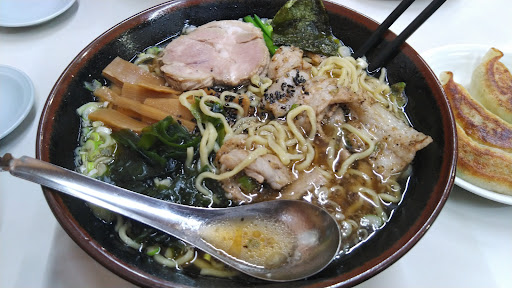 十八番ラーメンセットをいただきました 十八番ラーメンはニンニクとスパイスがガツンと利いたな豚バラがのった醤油ラーメンです 懐かしい町中華のスープなんですが具材のスパイスに負けない旨味が深い味わいを持ち、節や脂に頼らない調和のとれた逸品 手揉みの縮れ麺はこしがありスープに良く絡みます こう言う醤油ラーメン食べたかったんだと思ってしまいました ボリュームもありますよ ベーシックなラーメンで美味い!とはなかなかなりませんおみそれしました 餃子は大きめで野菜の風味が強く皮がもちもちでこれまた美味い! ラーメン様に飽...