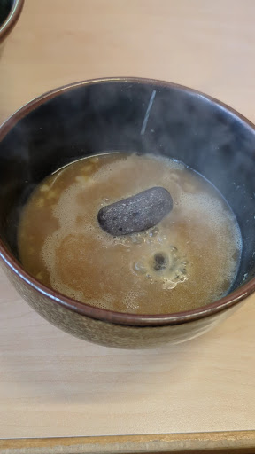 平日11時に久々の入店。職場が近くだった頃は通ったものです。赤つけと若干迷うも基本の特製つけそばに味玉追加で注文。昼の雑炊(ご飯+卵)サービス、スタンプカード提示の大盛無料変わらずやってて思わずにんまり。サイフ底からスタンプカード出てきたので、苦しいと解っていても大盛り+雑炊を選択。そして着丼。相変わらずの旨さです。モチモチの麺、柔らかいチャーシュー、味の染みた半熟味玉。そういえば家でもググって味玉作るようになったのはここの味玉が旨くてハマったのがきっかけだったなと思い出しながらつけ麺完食。さて、ここからが本番です。今日来たのはここの雑炊目当て。誉はスープ割りでなく、つけ汁にご飯と卵を入れて混ぜ、声高らかに「焼き石ください!」と頼むと桜島産溶岩石をあっつあつに熱して投入してくれるのです!ジューッと湯気と音がスゴいですが混ぜ混ぜしながら暫く待ってグツグツが収まって来たら食べ頃です。焼き石を皿に取り出し、レンゲでいざ実食!これが旨い!むしろメインと言ってもいいほど(笑)しかも昼は雑炊無料!スタンプカードで大盛も無料でなんてコスパのいいこと♪こんなにサービス良くていいんでしょうか?誉に来たら有料でも雑炊は絶対食べて下さい。まじうまです。注意点はつけ麺大盛にして雑炊も食うと腹ヤバいです。通ってた頃は普通盛+雑炊でした。満腹すぎるので。。今日は案の定腹パンパンになりましたが超満足でした。次回は赤つけ行くぜ〜!(ちなみに少食な方は麺少なめも出来るそうなの...