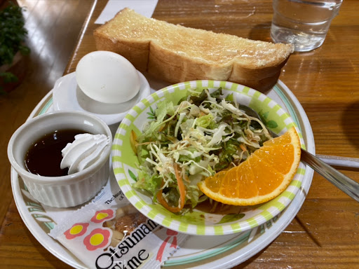Read moreモーニングに伺いました。リーズナブル。現金のみ? 国道21号沿いにあり、以前から入って見たかったのですが、いつも通り過ぎておりましたが、遂に入店。 モーニング・サービスは一択で、ドリンク代でトースト、ゆで卵、サラダ、カットフルーツ、ゼリー、小袋お菓子が付いてきます。ドリンクも450円から。ちなみに、ソーダ水は緑色でした。 平日9時前後に伺いましたが、地元の方々で賑わってましたが、まだ席に余裕がありました。中は思っていたより広く、座席は50席以上。 駐車場は10台くらい。 コンセントは窓際カウンターに1つ見つけました。Wi-Fiは見当たりませんでした。
