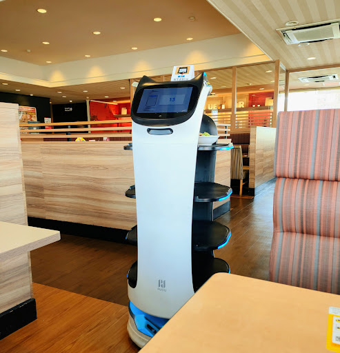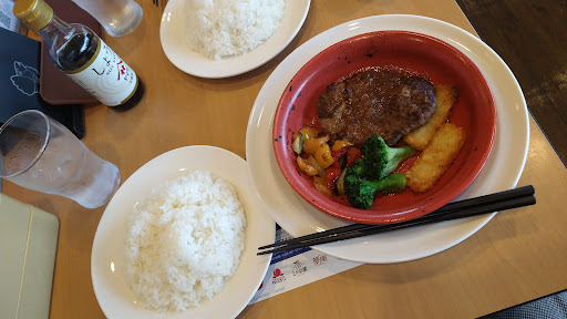 令和6年9月 ランチで利用 ビーフ100%粗挽きステーキハンバーグのセットにしました。 日替わりスープ(おかわり自由)とライスがセットになってます。 ホールにスタッフさんはウロウロしてましたが水もなかなか持って来てくれないんか?と思ってたらセルフで取りに行くんですね💦あまりファミレス系は行かないのでせめて説明してくれないと分かりません🤣 配膳はロボットが運んで来ましたがハンバーグとライスしか来なくてスープは遅れて来るんかな?と思ってたら同行の者がスープも取りに行くシステムかも?って言うので水を取りに行った所に行ってみるとスープが有り自分で注ぐと言う事が分かりました💦 頼むから説明してくれ😓 私が店長なら配膳ロボットに「スープは配膳しておりません、恐れ入りますが係の者にスープの場所をお聞き下さいm(_...