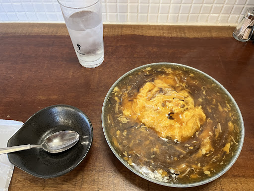 天津飯あるあるだと思いますが、大体餡が途中でなるなりかけるという事を皆さんも経験あると思われますが、こちらの餡はお皿目一杯入っているので、まず先に無くなる事はありません。 むしろ餡をガンガン食べる (スープを飲む?)様しないとほぼ間違いなく余る位入っています!! 完食すると、スープでお腹パンパンです。 でも凄く新鮮な幸せな気持ちになれました。 もし、変わった天津飯を食べてみたいなぁと思われる方には是非ともオススメのお店です。