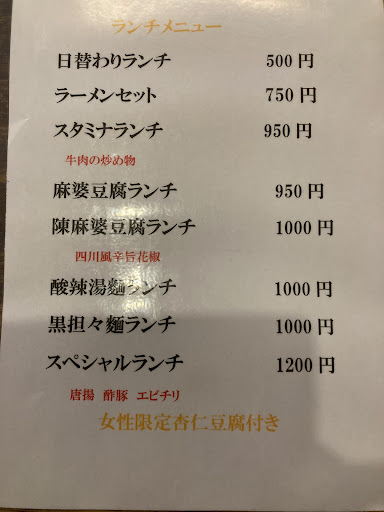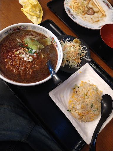 令和6年3月 ランチで初めて利用させて頂きました。 お店はカウンター5~6席?、テーブル席2、小上がり一つで丁度お昼だったせいも有りほぼ満席 そして殆どの席に料理はまだ配膳されて無かったのでかなり時間がかかるかも?と思ってたんですがやはり中華だからかかなり早くにきました😃 私は黒坦々麺と小炒飯のセット1000円(税込)、同行者はスタミナランチ950円?だったかな?(税込) 黒坦々麺は胡麻の風味がしっかりとしていて美味しかったです😋麺は細麺で私の好み。 炒飯は忙しい時間帯だったからかパラパラと言うよりしっとりふっくらで味は私の好みの若干薄...