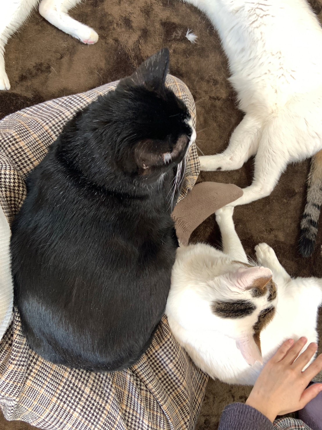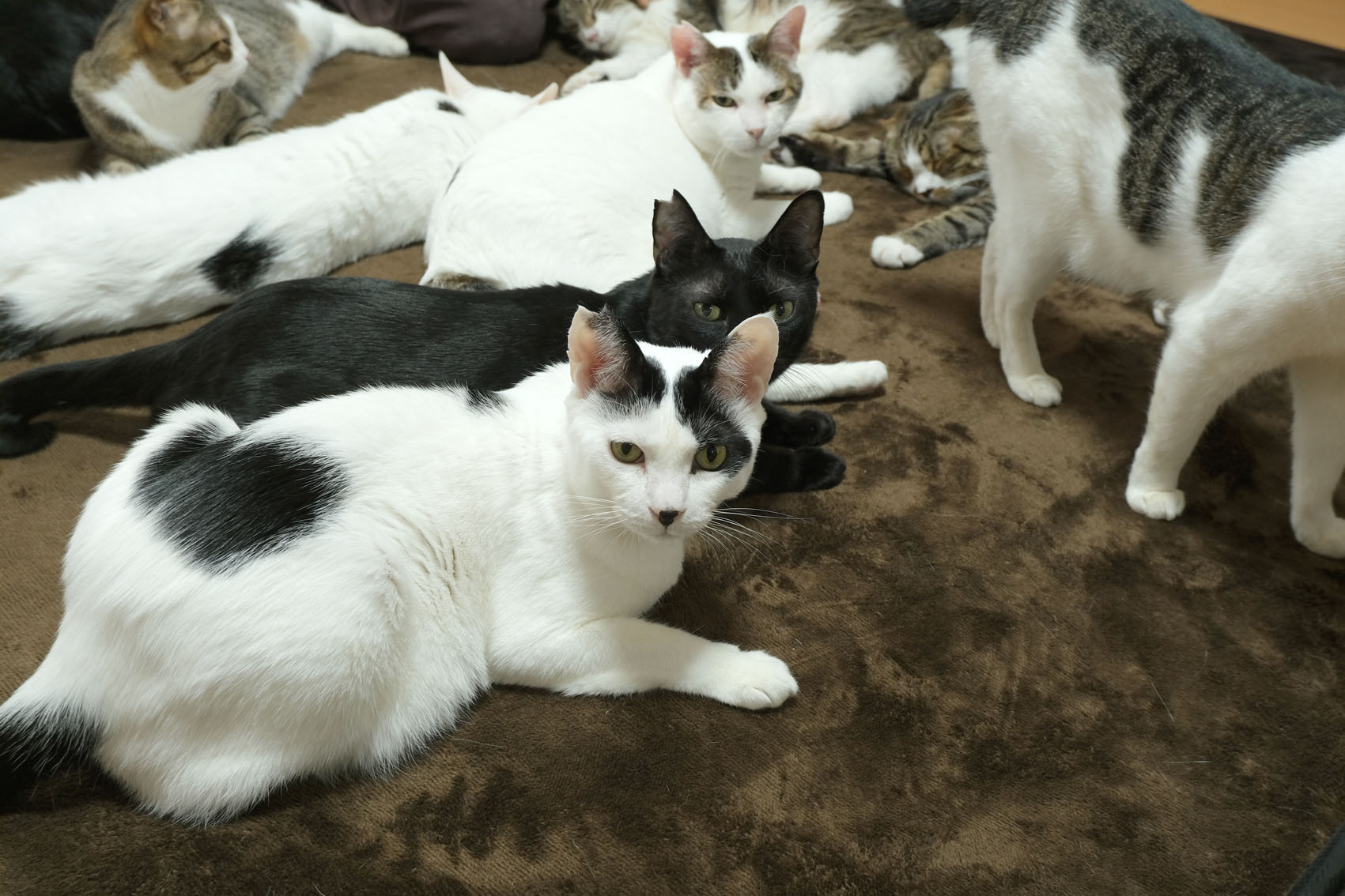 家族3人で行きましたが、部屋に入るとすぐ寄ってきて頭を擦り付ける猫もいれば、ホットカーペットに転がったまま「なんや?」とこっちを見るだけの猫(多い)やソファ、棚の上から見てくる猫もいます。みんなとても自然体。でもみんなとても友好的で人好きです。