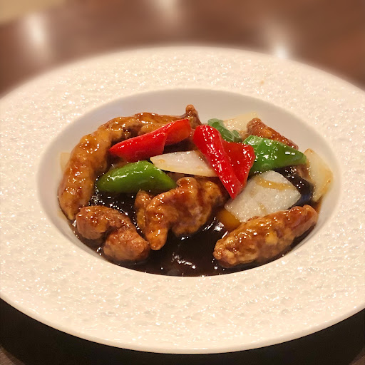 〇フカヒレのステーキ、陶板仕立て 登場した瞬間にテンションMAX! めっちゃグツグツな状態でプレゼンしてくれはります! もぅ、食べる前からうまい! 取り分けはお店の方がしてくれはりますので、ケンカしなくていいね。 表面が焼かれたフカヒレの食感がめっちゃくちゃにいい! 適度にカリっ! ぷつぷつくにゅくにゅしゃくしゃく。 そして、あんかけのうまさよ。 少し印象は強めですが、かなり奥深いじんわり系。 鶏とオイスターソースがベースぽい。 分厚いフカヒレに負けずにグッとくる。 これは、うまい!