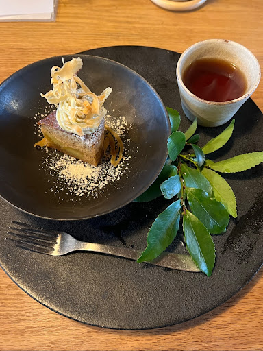 デザートに、ヴィーガンでグルテンフリーなバスク風チーズケーキ。コクがあるのに、爽やかさもある。本当に今まで食べたヴィーガンケーキで、一番チーズケーキのような美味しさでした!爽やかなヨーグルトとココナッツのクリームも、相性バッチリです。 香り高いのに、爽やかさがあるファーストフラッシュダージリンティーと一緒に頂けます。