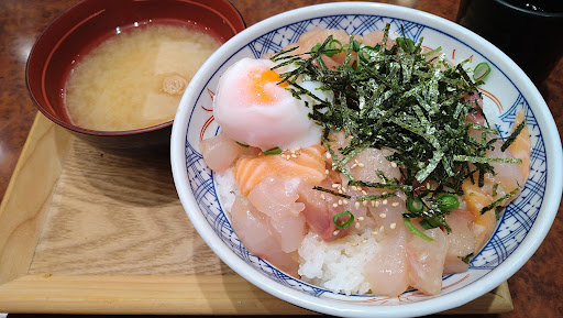 【こりゃランチの丼物は✕だな。】数量限定の銘を打った「日替わり漁師飯丼」を酢飯大盛りで注文。で、非常にガッカリした。①箸が通りにくほど冷えた酢飯が硬かった。上手く言えないが所々ブロックの塊のようになっていたし、上からギュと押さえたんか?②トロリとした半熟玉子をネタに絡ませたかったのに、半熟と思いきや少しボイルし過ぎのネットリの卵だった。絡まさせて食べたら美味しいだろうなぁ、というワクワク感が飛んでいった、とほほ、、。牛丼屋さんの半熟を見習いましょう。全く細やかさが足りないなぁ。③しかもバエ無い。せめてメニュー写真の盛り付けのように玉子真ん中にして美味しく見せようよ。新装開店したんでしょ? こういった所で手ぇ抜いてたら綻んでくるよ、ジワジワ後から。改善しないなら地元でも応援しないなぁ。あ、お味噌汁は味が濃く美味しいと思ったのと、酢飯大盛り(+50円)は確かにお腹いっぱいにな...